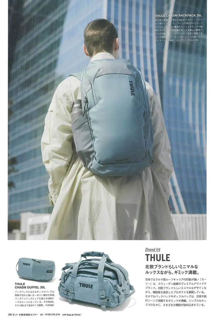 雑誌『GO OUT 2026年4月号 Vol.198』(2026年2月28日発売)の「フィールドでも街でも映える、注目5ブランドのバックパック特集」にて「Thule Chasm Backpack 26L」と「Thule Chasm Duffel 30L」をご紹介いただきました。